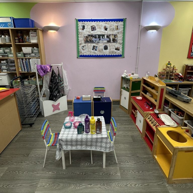 Our vibrant role play corner is a favourite among children, offering endless opportunities for creativity, confidence-building, and social development. Currently themed as a Hair Salon, this space invites children to step into character, collaborate with friends, and explore real-world scenarios through imaginative play.